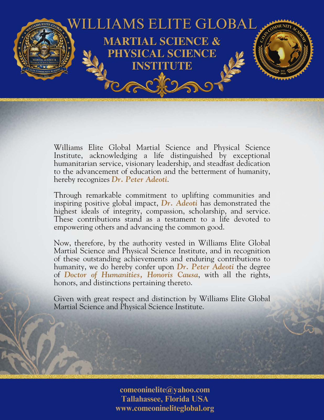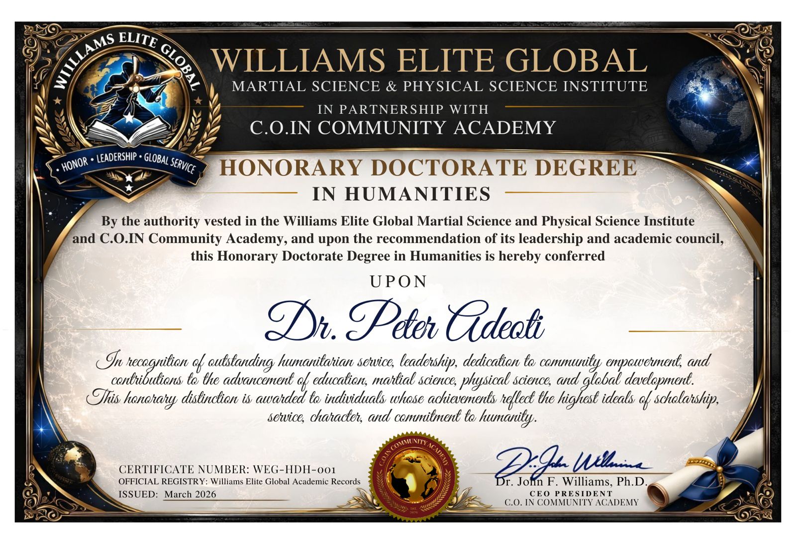 This honor, graciously conferred by the Williams Elite Global, Martial Science and Physical Science Institute in partnership with C.O.IN Community Academy and presented by Dr. John Fitzgerald Williams, recognizes a life committed to serving people with love, faith and compassion.